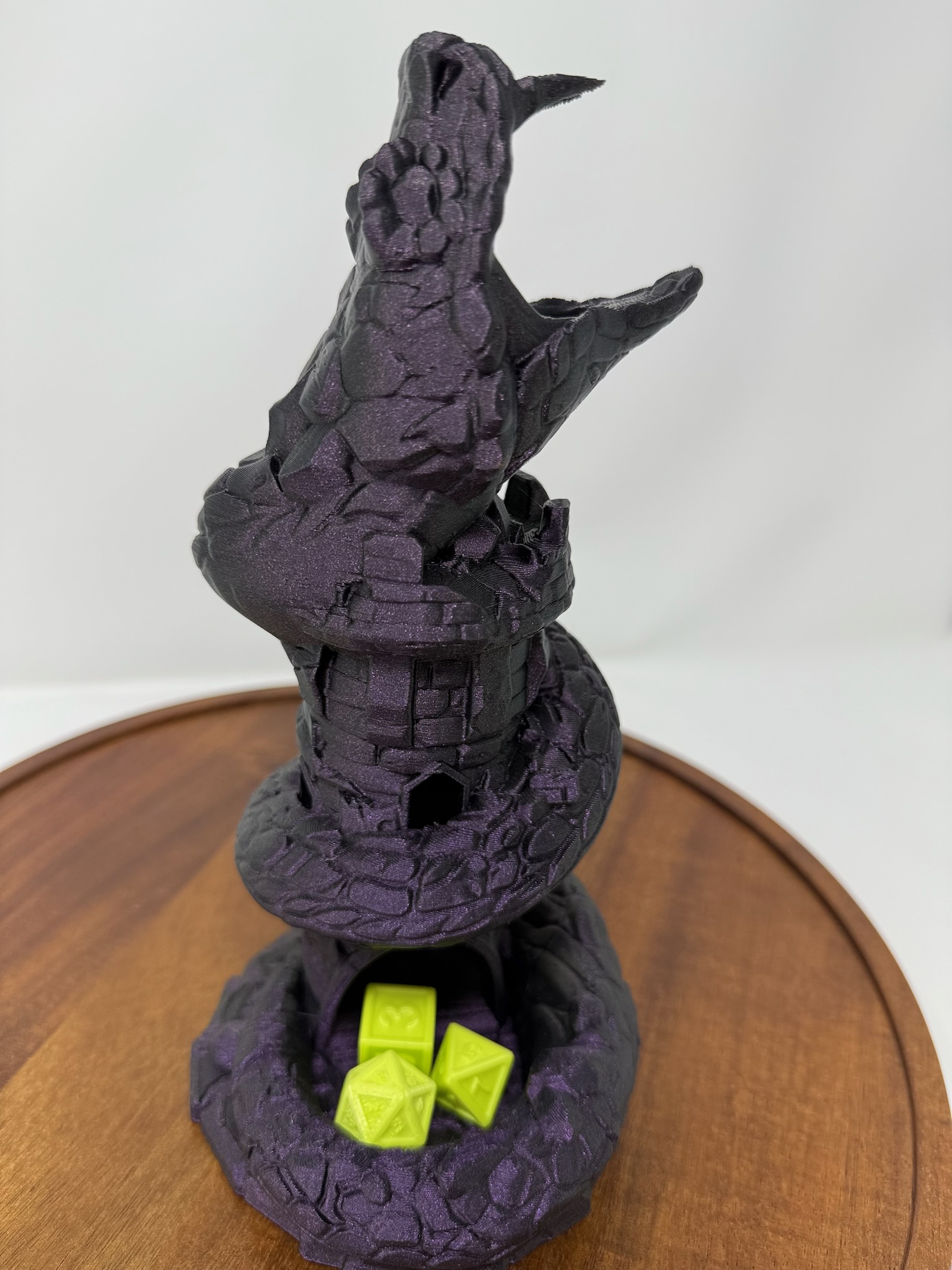 Designed for both display and utility, the internal channel ensures smooth, randomized rolls for standard-sized dice. Made from high-quality PLA, each piece is printed to order and available in custom color schemes to match your campaign’s theme – from aged stone and serpent scales to fantasy bronzes and mystical purples.